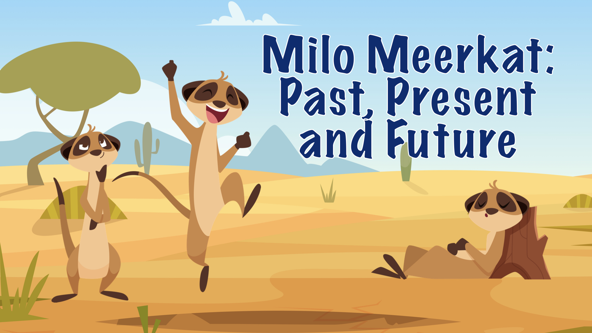 Milo Meerkat stands in the middle of the desert, looking at three strange footprints in the sand. “The past is where I was,” he says, pointing to the first print. “The present is where I am,” he adds.